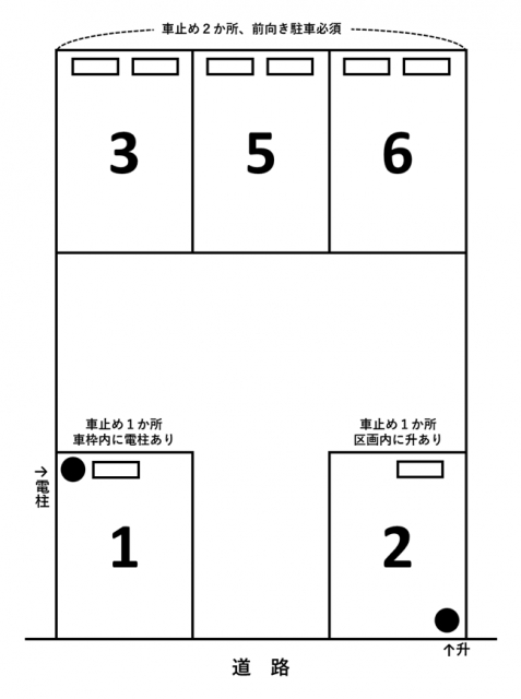 区画1:車止めの横に電柱あり 区画2:区画内に升あり 区画3・5・6:前向き駐車 車庫証明必要書類発行手数料は4,400円(税込)です。 |