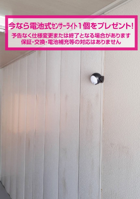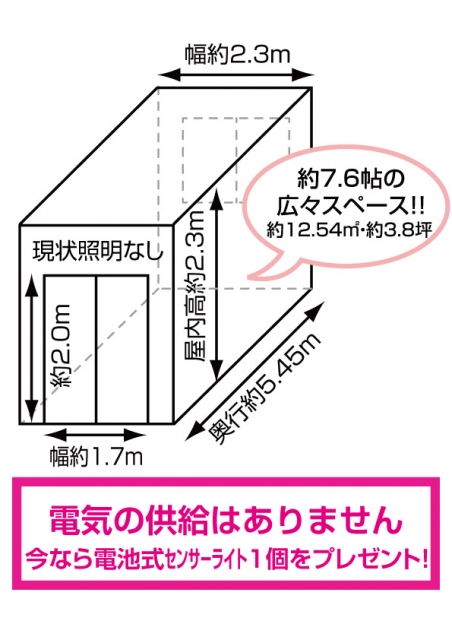 【B棟】今だけ特典!ご成約でセンサーライト1個プレゼント! (1契約につき1個限り。交換・保証はありません。特典は予告なく変更・終了する場合があります) 部屋番号 広さ 幅x奥行x室内高(m) B-1~B-5 約12.54㎡ 約2.3m×約5.45m×約2.3m |