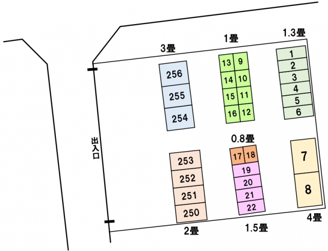 部屋番号 広さ 月額利用料(税込) 幅x奥行x高さ(cm) 17・18 0.80畳 4,400円 110×110×225 9~16 1.00畳 5,500円 145×110×225 1~6 1.30畳 7,040円 90×225×225 19~22 1.50畳 8,250円 115×225×225 250~253 2.00畳 9,900円 145×225×225 254~256 3.00畳 12,650円 190×225×225 7・8 4.00畳 18,480円 290×225×225 |