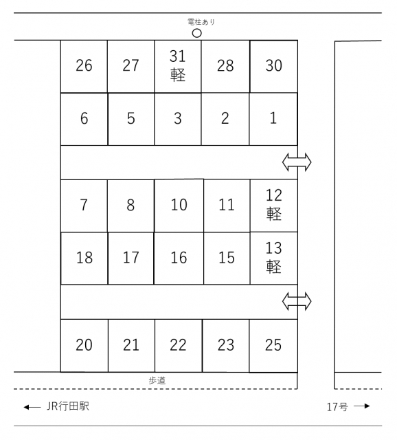《特記事項》 (1) 12,13,31 番区画は軽自動車専用区画とする。 《注意事項》 初回の入庫について、ご契約後は現況有姿でのお引渡しとなります。 リアオーバーハング、タイヤ幅、最低地上高等車検証には記載の無いサイズもあることから、使用するお車のサイズが駐車場のサイズ制限内かどうかは必ず現地にてご自身でご確認ください。 初回入庫時には事前にサイズを確認の上、十分注意をして入出庫をお願いいたします。 試し入れ時や契約後に事故等が発生した場合、貸主及び管理会社並びに保証会社では一切の責任を負いかねます。 《遵守事項》 使用者は本駐車場においては下記事項を守らなければならない。 (1) 引火性物件その他危険物を持ち込まないこと。 (2) 火気の取り扱い等をしないこと。 (3) 車両の出入りの際は駐車位置、交通規制等の駐車場内の秩序について、管理者の指示に従うこと。 (4) 車両の運転に当たっては安全運転をすること。 (5) 甲又は丙の許可を得たもの以外、物品の販売、自動車の修理(簡易な修理を除く) その他秩序を乱す行為は一切行わないこと。 (6) 駐車場において物件を損傷し又は事故を起こしたときは直ちに甲又は丙に届け出ること。 (7) 駐車場内に空き缶・タバコの吸殻等を廃棄しないこと。 (8) 他の車両の駐車位置を侵さないこと。 (9) 予め駐車場の取扱説明書を確認し、その記載事項に従うこと (10) その他甲又は丙の定める一般的な指示に従うこと。 車庫証明必要書類発行手数料は3,300円(税込)です。 |