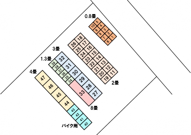 部屋番号 広さ 月額利用料(税込) 幅x奥行x高さ(cm) 1~10 0.80畳 4,300円 110×110×225 34~39 1.30畳 7,200円 90×225×225 11~26 2.00畳 10,100円 145×225×225 40~43 バイク用 12,300円 145×225×225 27~32 3.00畳 14,300円 190×225×225 44~47 4.00畳 17,200円 290×225×225 33 8.00畳 34,400円 230×580×225 |